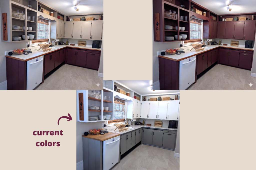 I understand why AI is controversial, but I use it now and then – sorry! Lately, it has been helpful in planning some aesthetic changes to our kitchen. When we moved in, the kitchen had red floors, yellow walls and countertops, and orangey wooden cabinets. I over-corrected so now the colors are not very interesting.