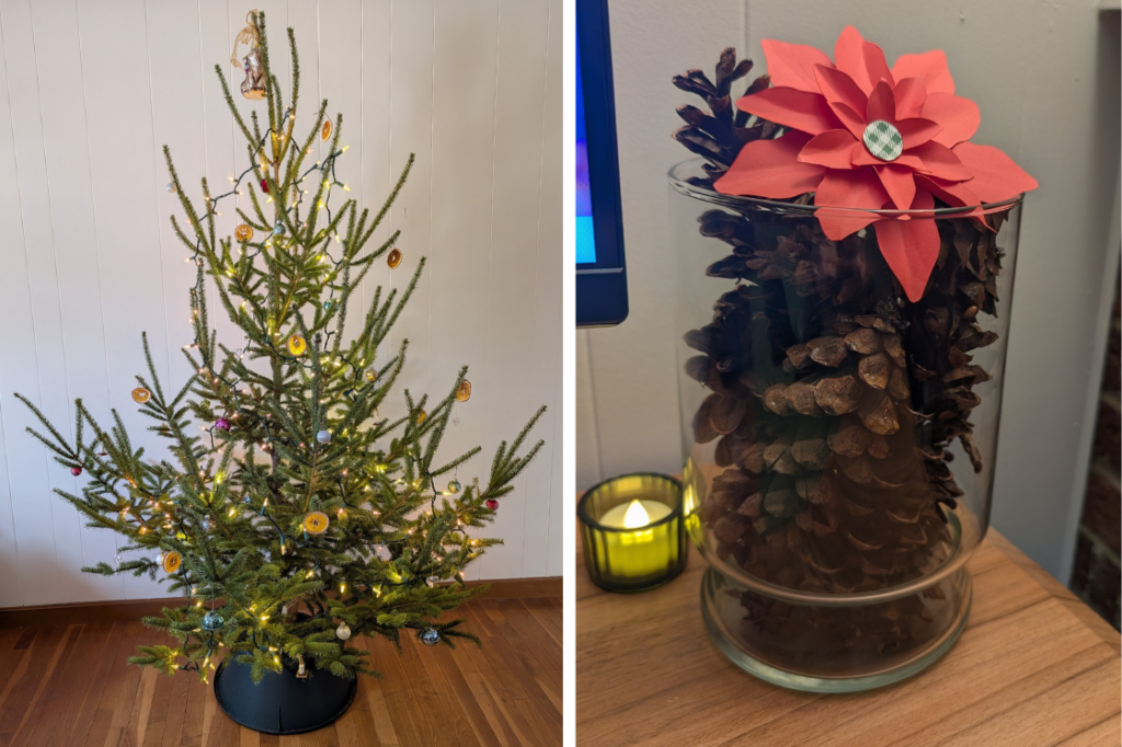 We cut down a real pine tree for the first time in a few years, and I dried orange slices to use as ornaments. I also made clementine pomanders (not pictured) and filled a vase with dried pine cones. Everything I did was simple, but it was nice to bring a little bit of nature inside through the winter months.