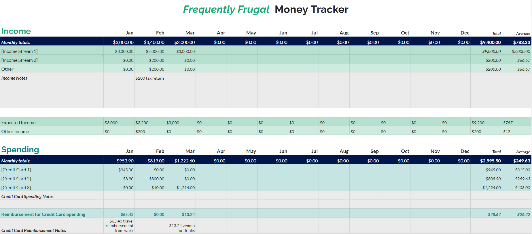 Read on for a breakdown of the Frequently Frugal Money Tracker and how you can put it to use in your own life. The sample numbers in the sheet are made up, but hopefully they will give you a sense of what this simple practice could look like for you.
