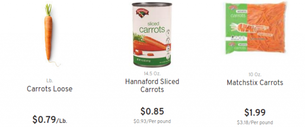 Notice how the canned carrots are only slightly more expensive ($0.93/lb) than the whole, fresh carrots ($0.79/lb) – while the fresh “matchstix” carrots ($3.18/lb) are about triple the price per pound!