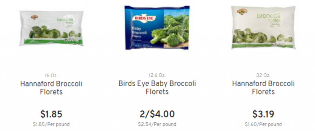 As you can see, the 32 oz. bag of frozen broccoli costs $3.19. You could do the math yourself to figure out the price per pound: